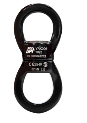 Destorcedor de corda utilizado para não permitir que a corda ou fita se enrole, atrapalhando as atividades verticais. Quando colocado entre uma carga e um sistema, permite que a carga gire em torno de seu eixo, deixando todo o sistema estável, facilitando os serviços.