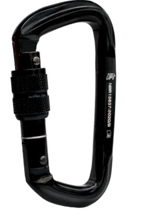 "D" com trava de rosca, desenvolvido para atividades em altura e resgate. Na cor